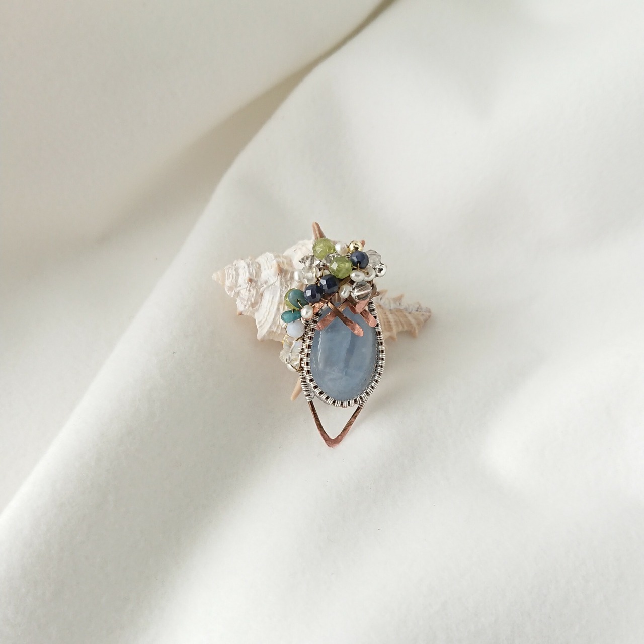 今回は、無謀にもワイヤーラッピングをしたのですがやはり脆い石なので気をつけました。取り扱いもご注意下さい。天使の石とも言われるこの石に沢山の小粒ビーズを盛りました♪。ペンダントトップですが、編み紐で良かったら着けますのでその際は購入前にメッセージを下さい。〗