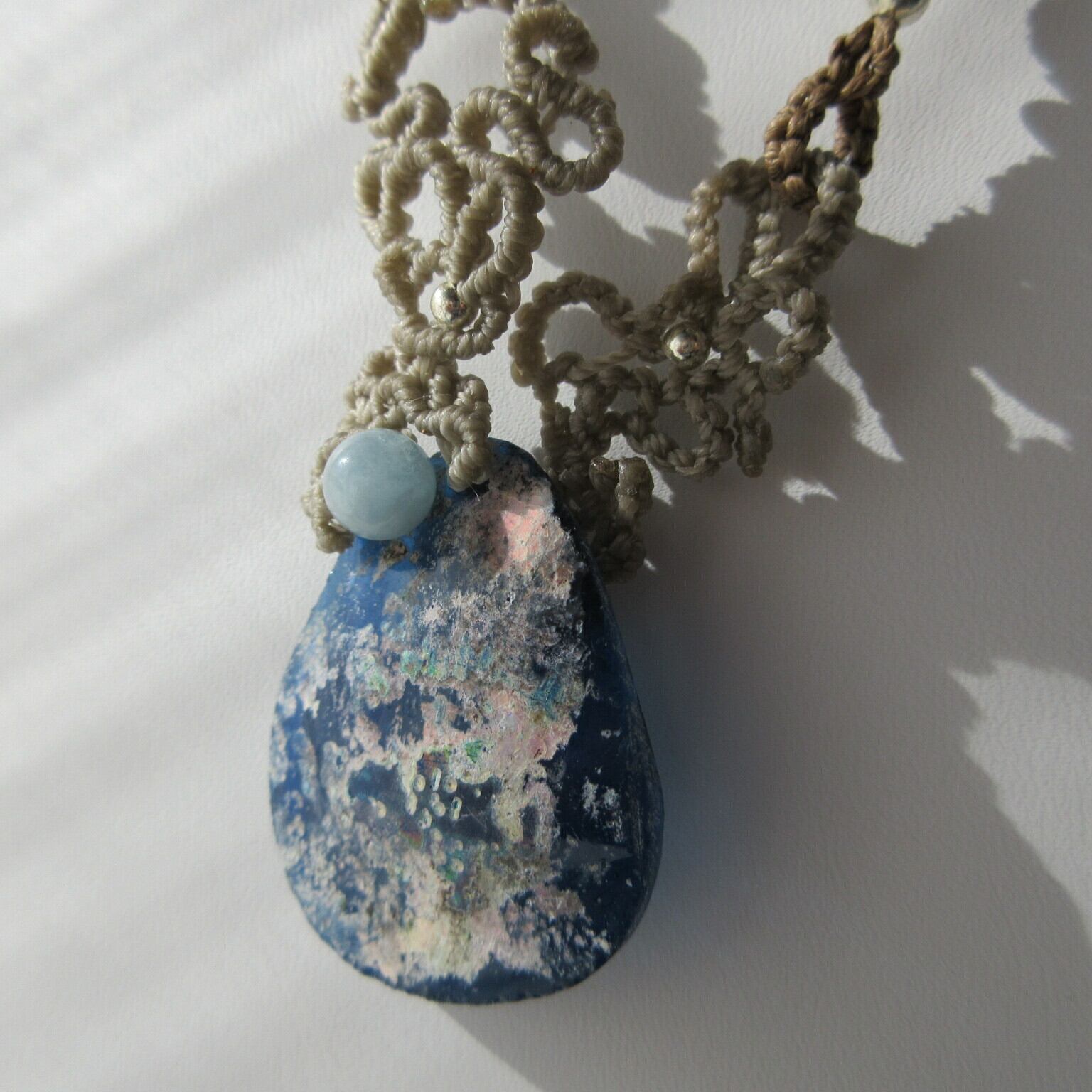 裏も表も楽しめる♪ローマングラスのリバーシブルマクラメ編みペンダントです。