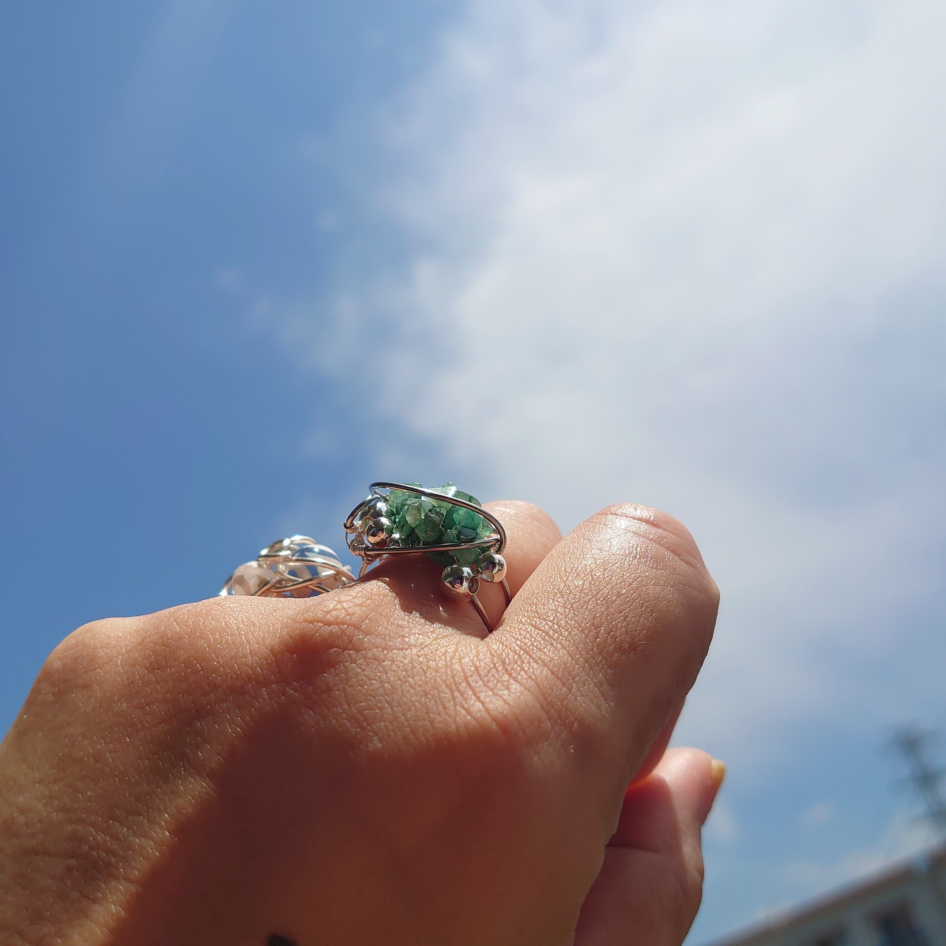 〖さざれは数ありますが、エメラルドのさざれでとても綺麗なものを見つけたのでリングにしてみました。宝石として有名なエメラルドですが、なかなか大きな物を身につけるのは色々な意味で難しいので、カジュアルに着けられる、でもエメラルドとしての美しいグリーンの発色を叶えたリングにしました。大ぶりで夏のアクセサリーにピッタリだと思います♪〗