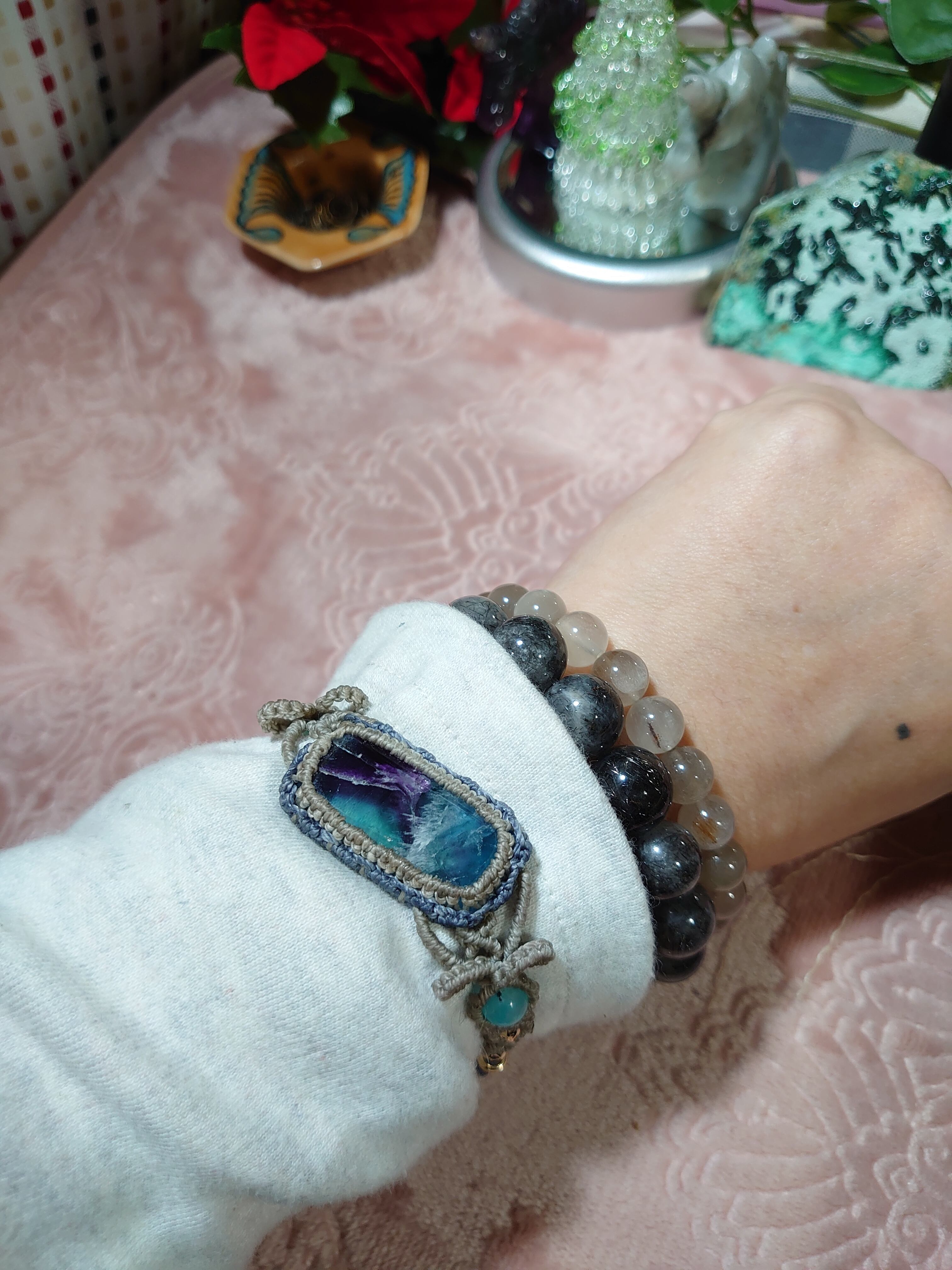 美しい色味のエンジェルフェザーフローライトに、虹がキラキラと光るアイリススモーキークォーツ、ブルーフローライトを合わせました。