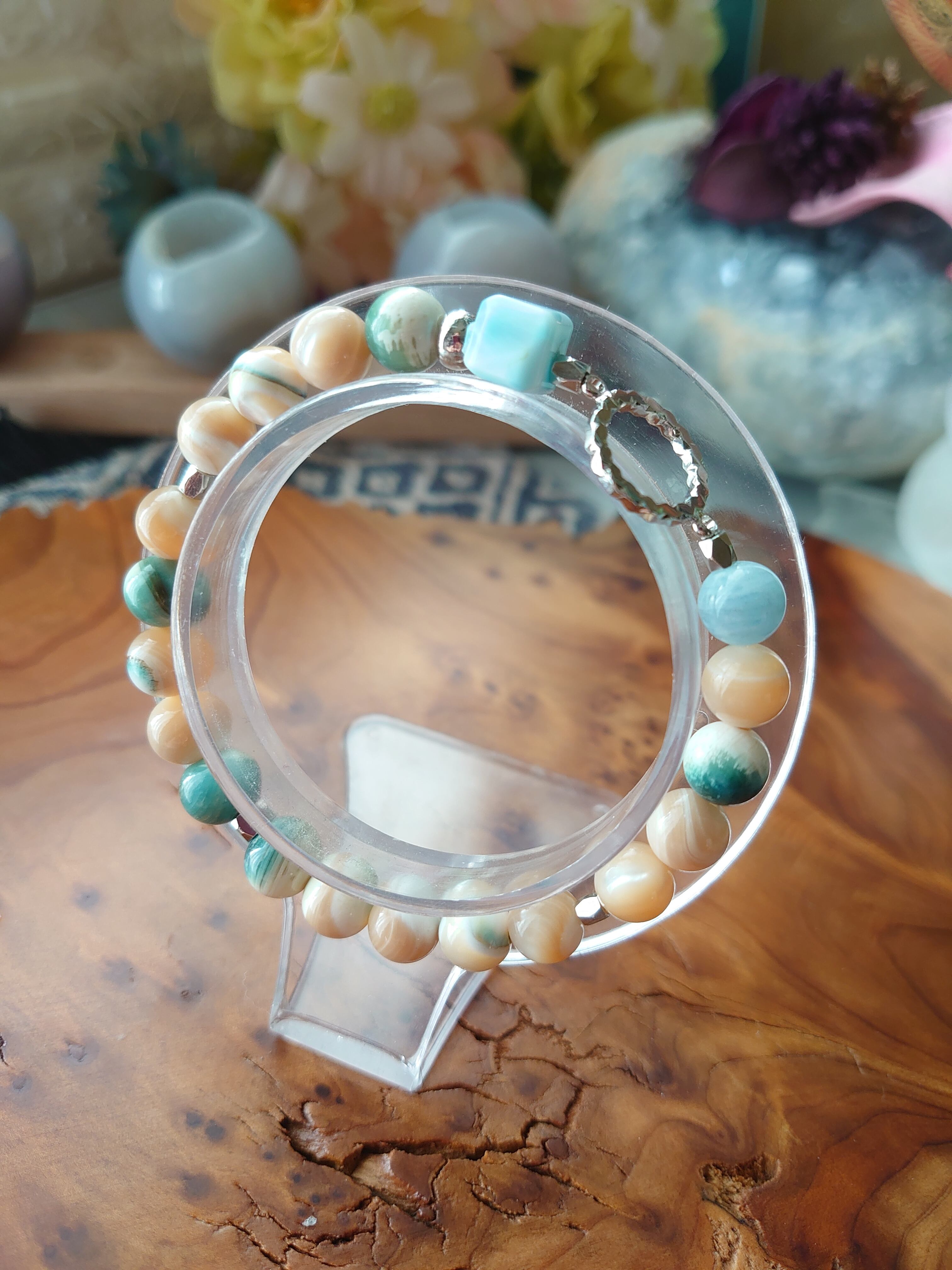 〖とても美しい夜光貝です。ホワイト、ベージュ、グリーンのコントラストがワクワクします!コチラにそれぞれシルバームーンストーンとアクアマリンをワンポイントに添え、海からの贈り物と言うことでラリマーをひと粒入れました。コレからの夏には心ウキウキするお供になってくれると思います。
