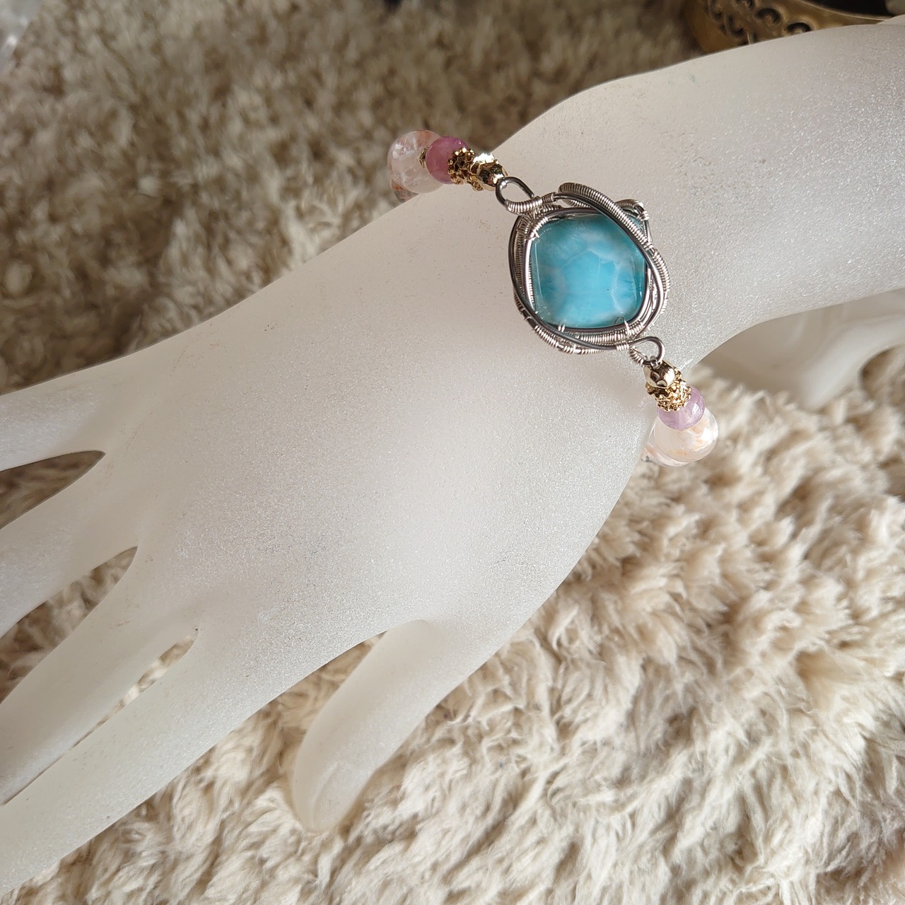 〖カリブ海の水面と言われる美しいブルーのラリマーをワイヤーでラッピングしたデザインブレスレットです。ラリマーは癒やしの石として有名にまりましたが、パワーは幅広いと思います。海が大好きな方にはとても良いのではないかと思います。