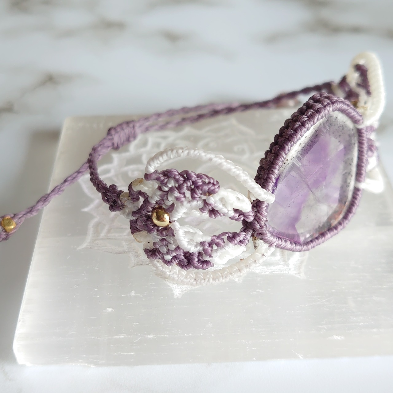 珍しいトラピッチェタイプのアメジストのマクラメ編みブレスレットです。