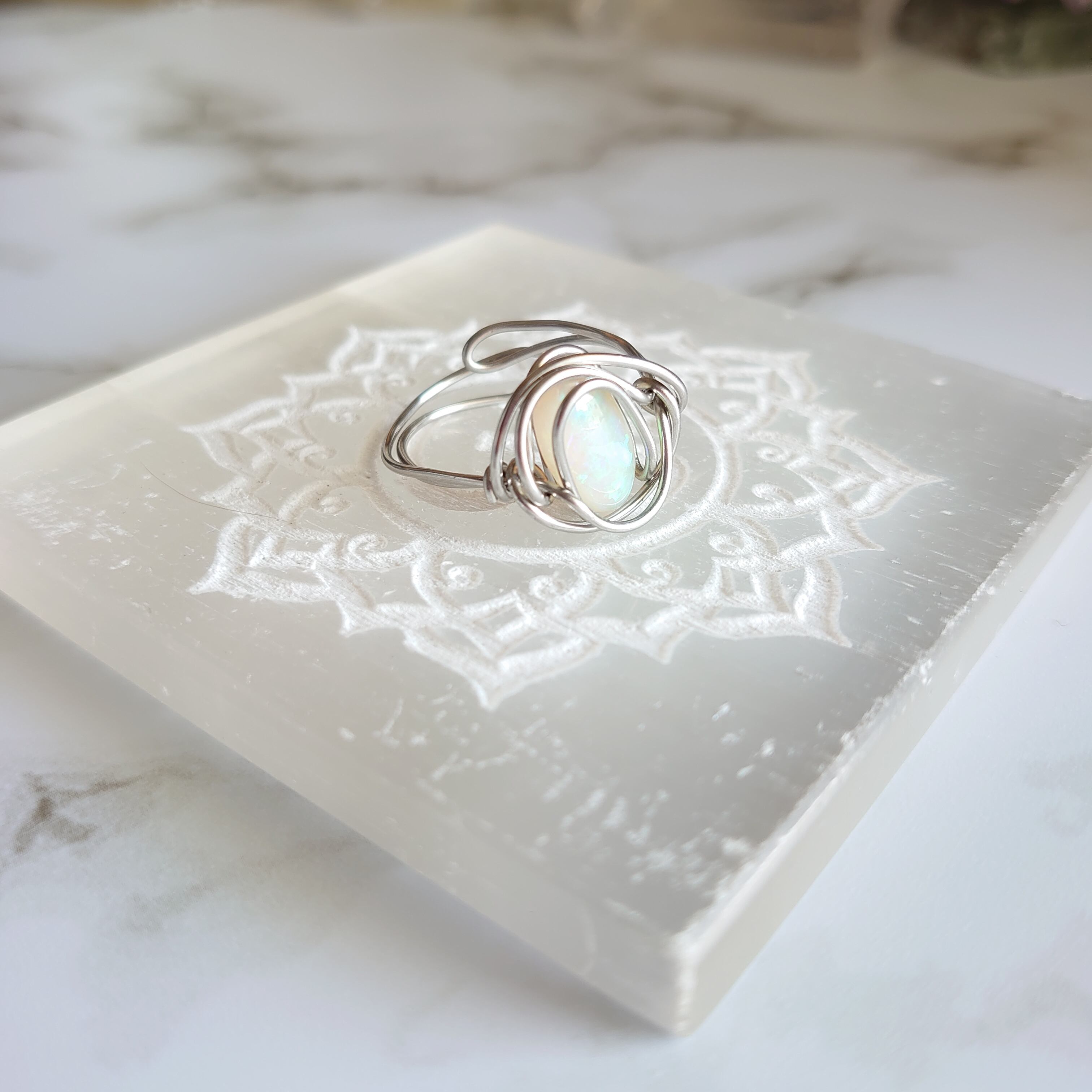 様々な色彩の光が魅力敵なプレシャスオパールのワイヤーリングです。