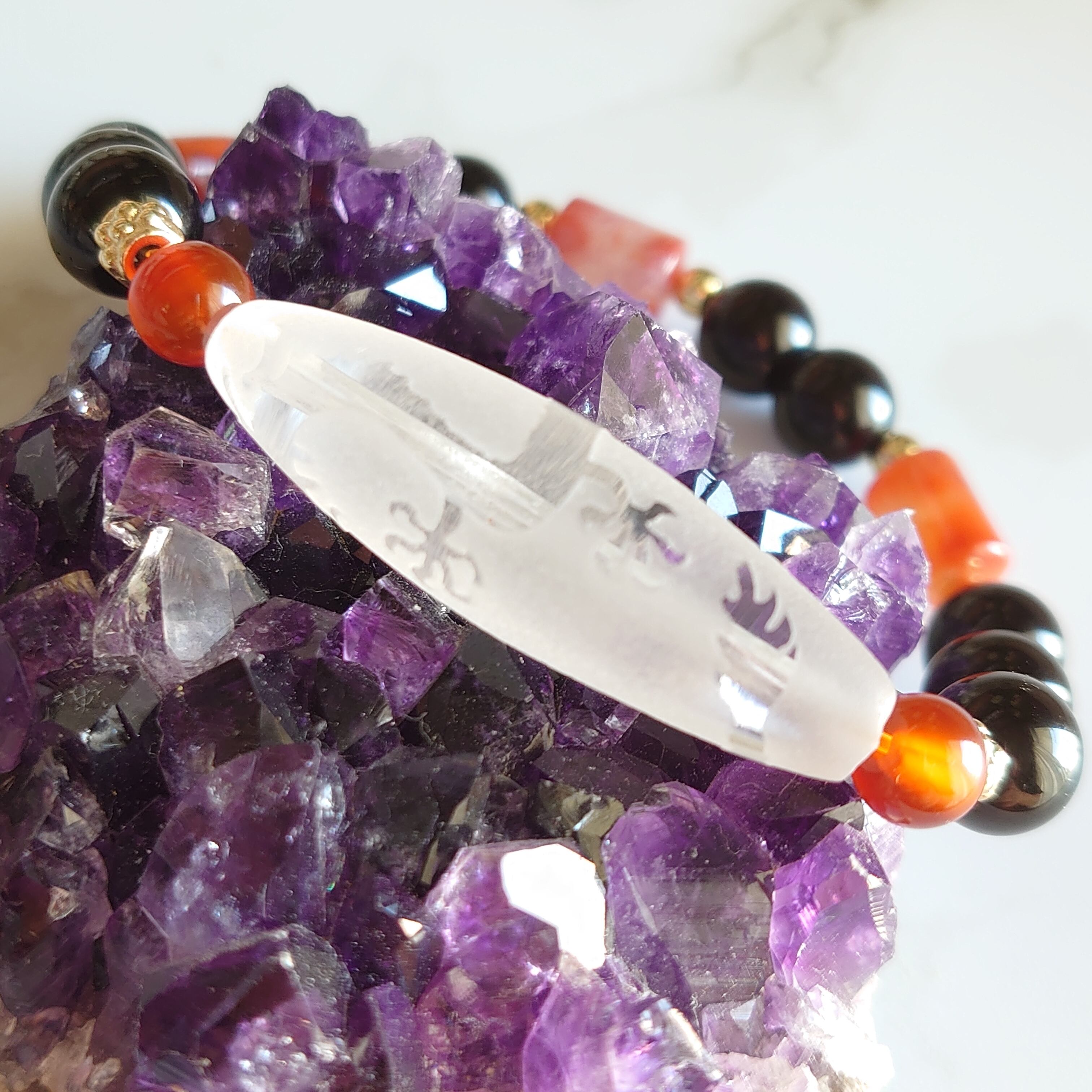 水晶の龍神が彫られた龍神天珠をモリオンでデザインブレスレットにしました。