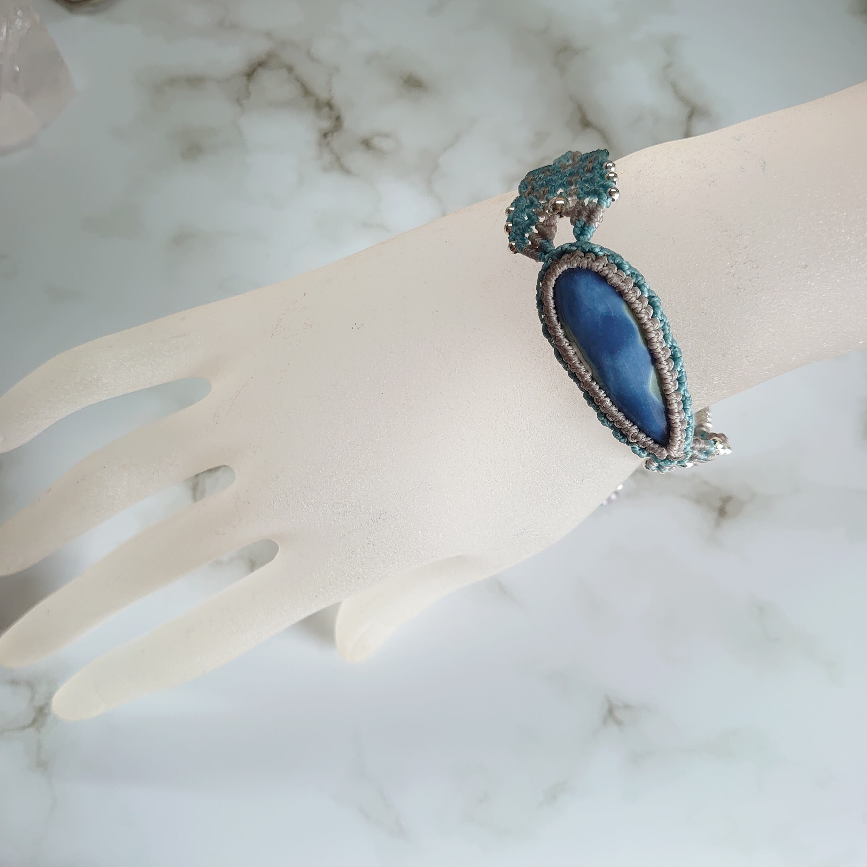落ち着いたブルーが美しいブルーオパールのマクラメ編みブレスレットです。