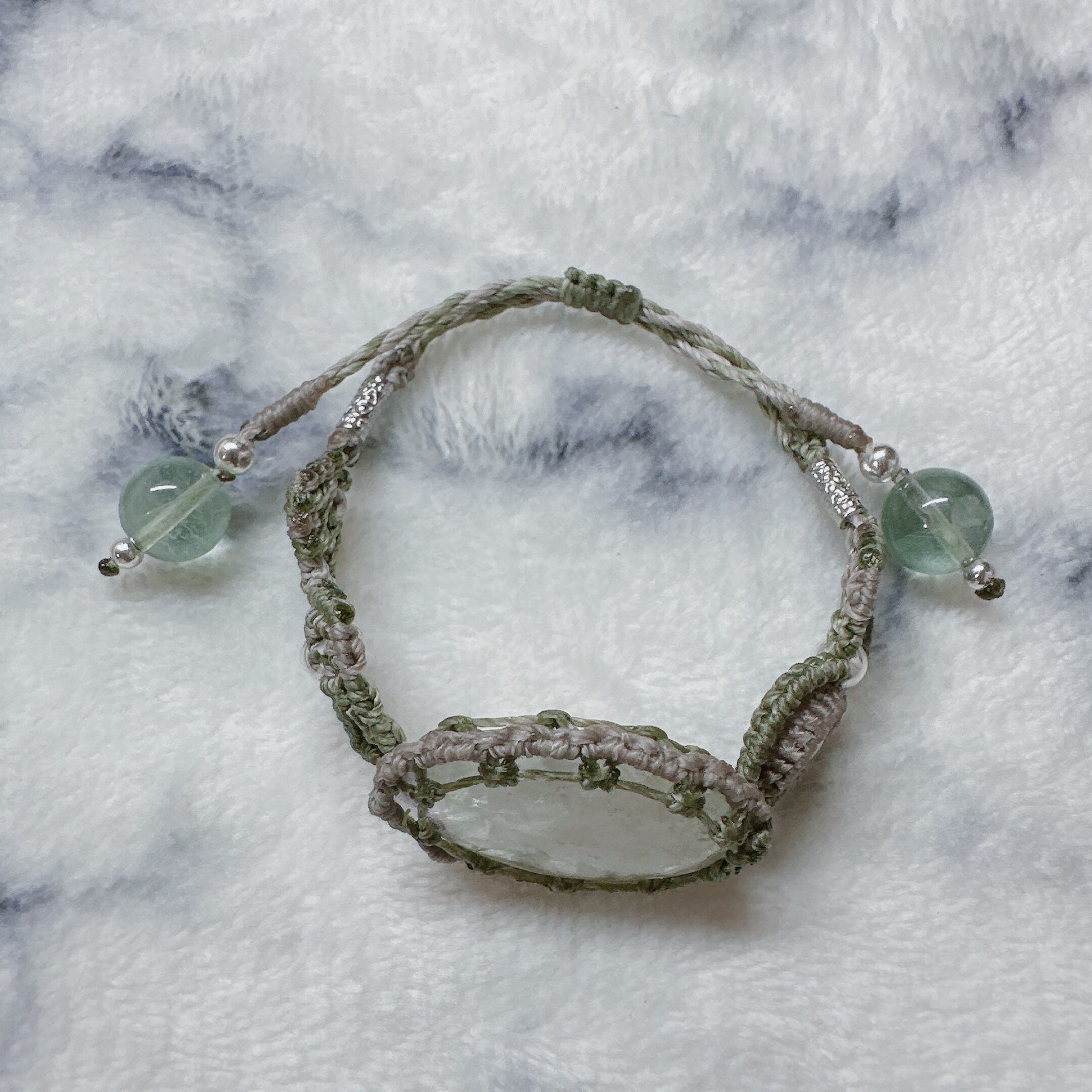 美しい羽根のような模様が見えるエンジェルフェザーフローライトのマクラメブレスレットです。