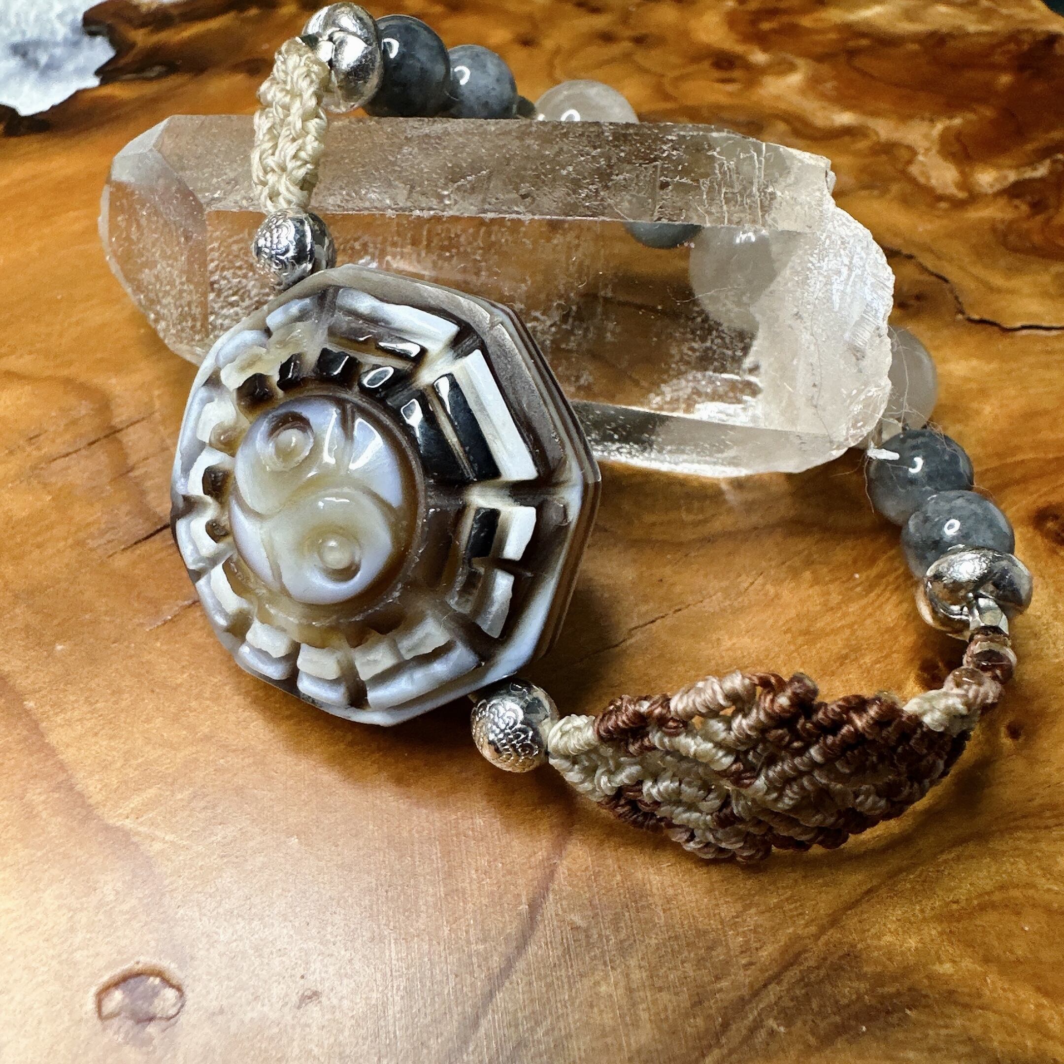 《風水アイテムでもお馴染みの八卦太極ですが、今回は裏面に眼が彫られています。第三の眼の開眼能力強化も出来そうな程に美しく彫られています。強力なお守りとなりそうです。今回は、豊かさの象徴シトリン、邪気払い強化の黒翡翠をそれぞれ入れたマクラメのデザインブレスレットにしました。限定一つずつですのでお早めに!》