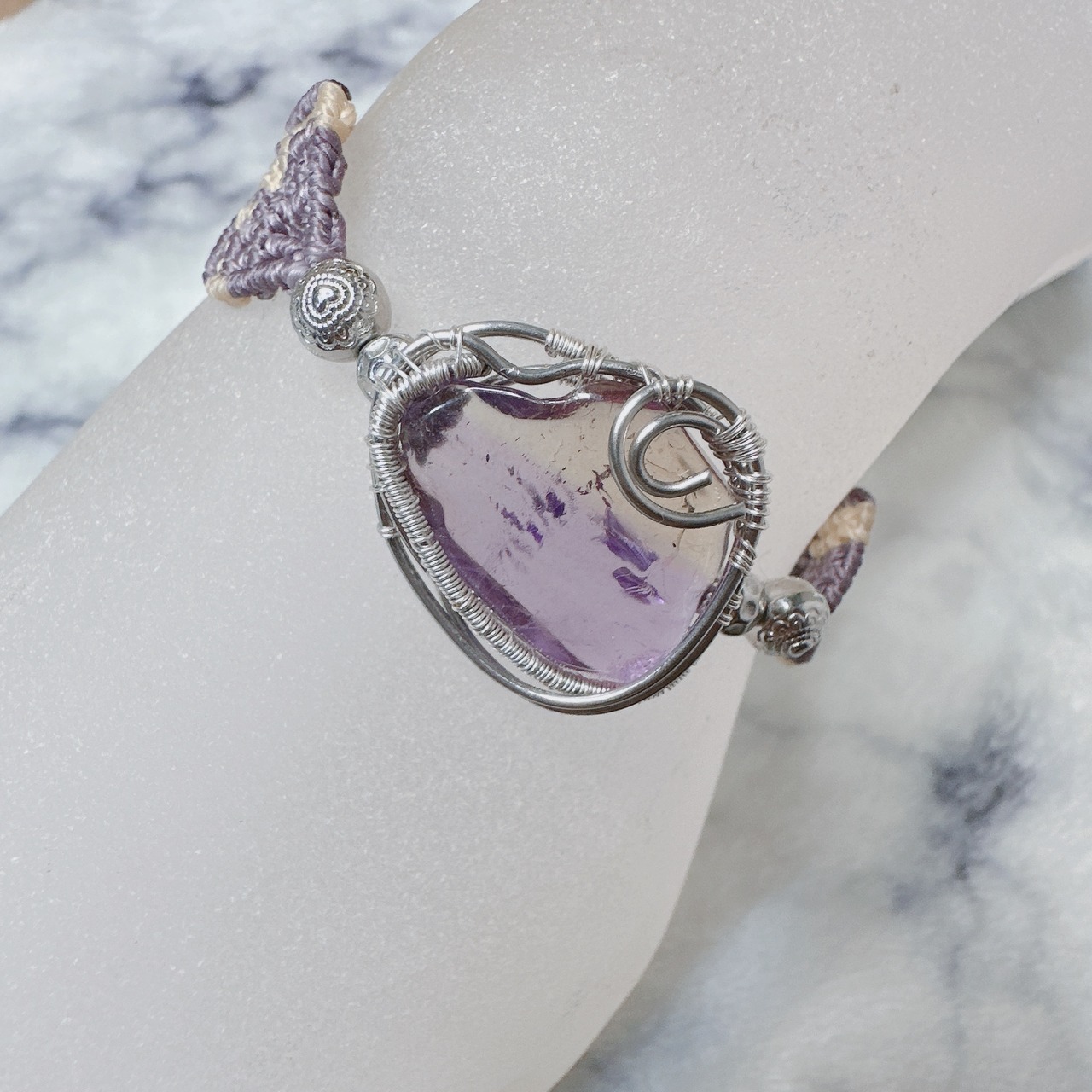 〈ラフカットのアメトリンです。肌に乗せてもしっかりとバイカラーの様が確認できます。透明度も良く見入ってしまうと吸い込まれそうな美しい天然石です。ワイヤーとマクラメで装飾しました。〉