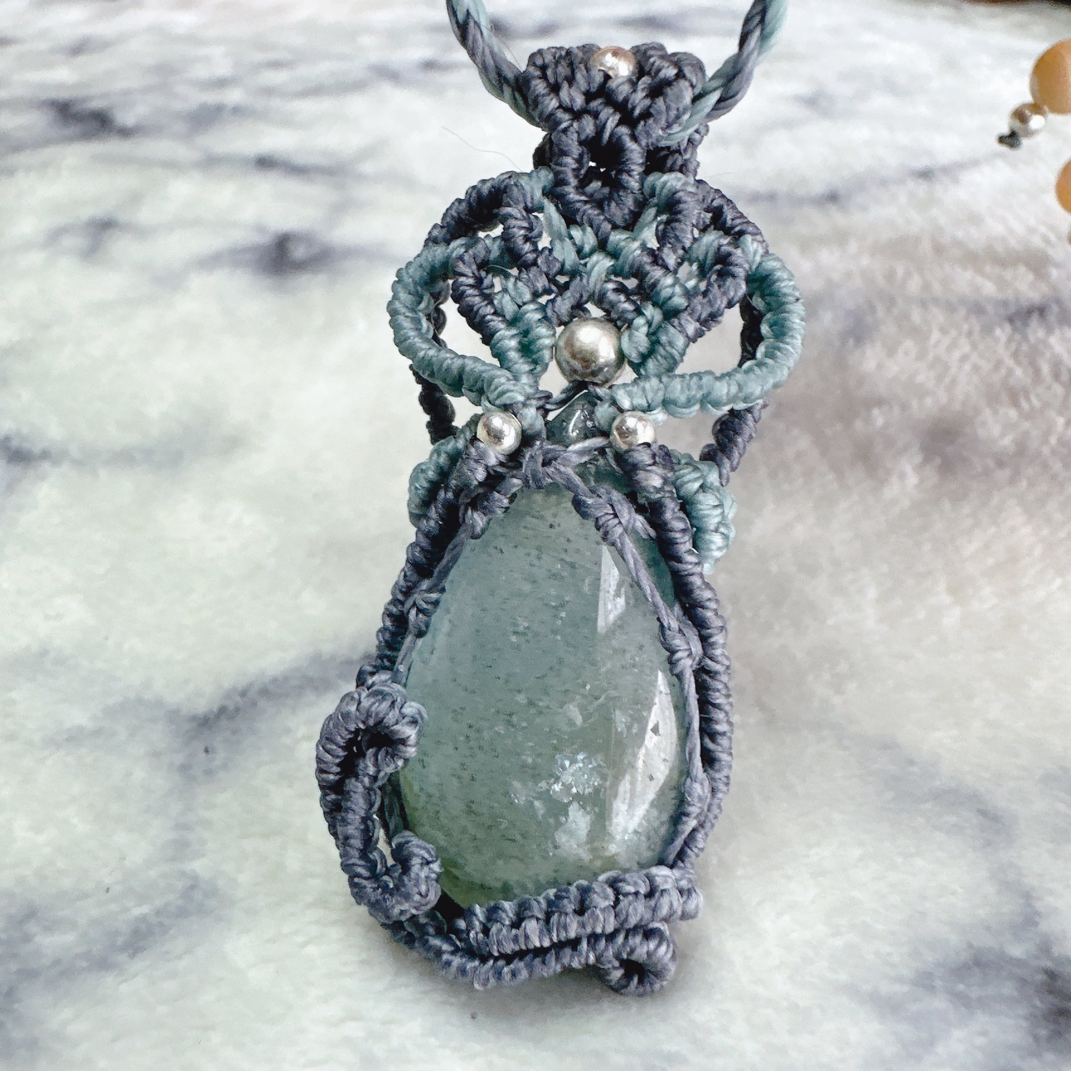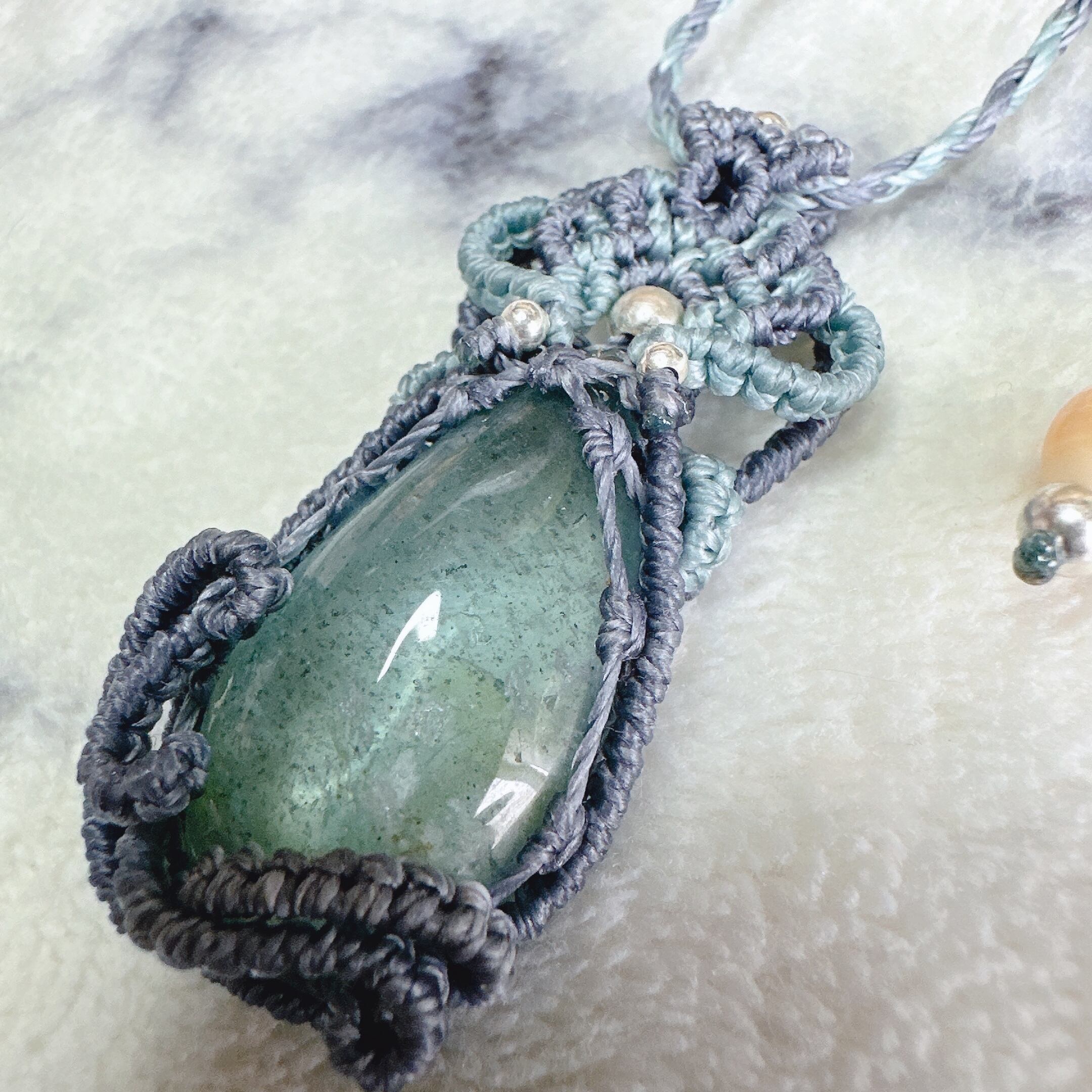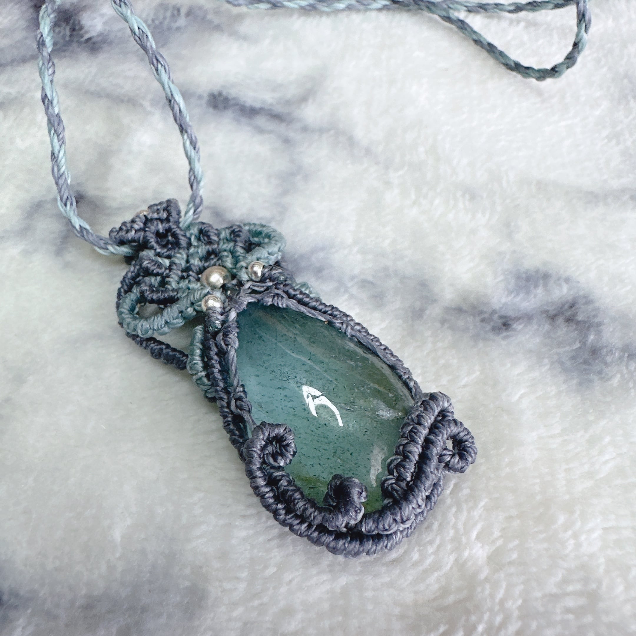 深海のような神秘的な魅力のある石モスアクアマリンのマクラメネックレスです。