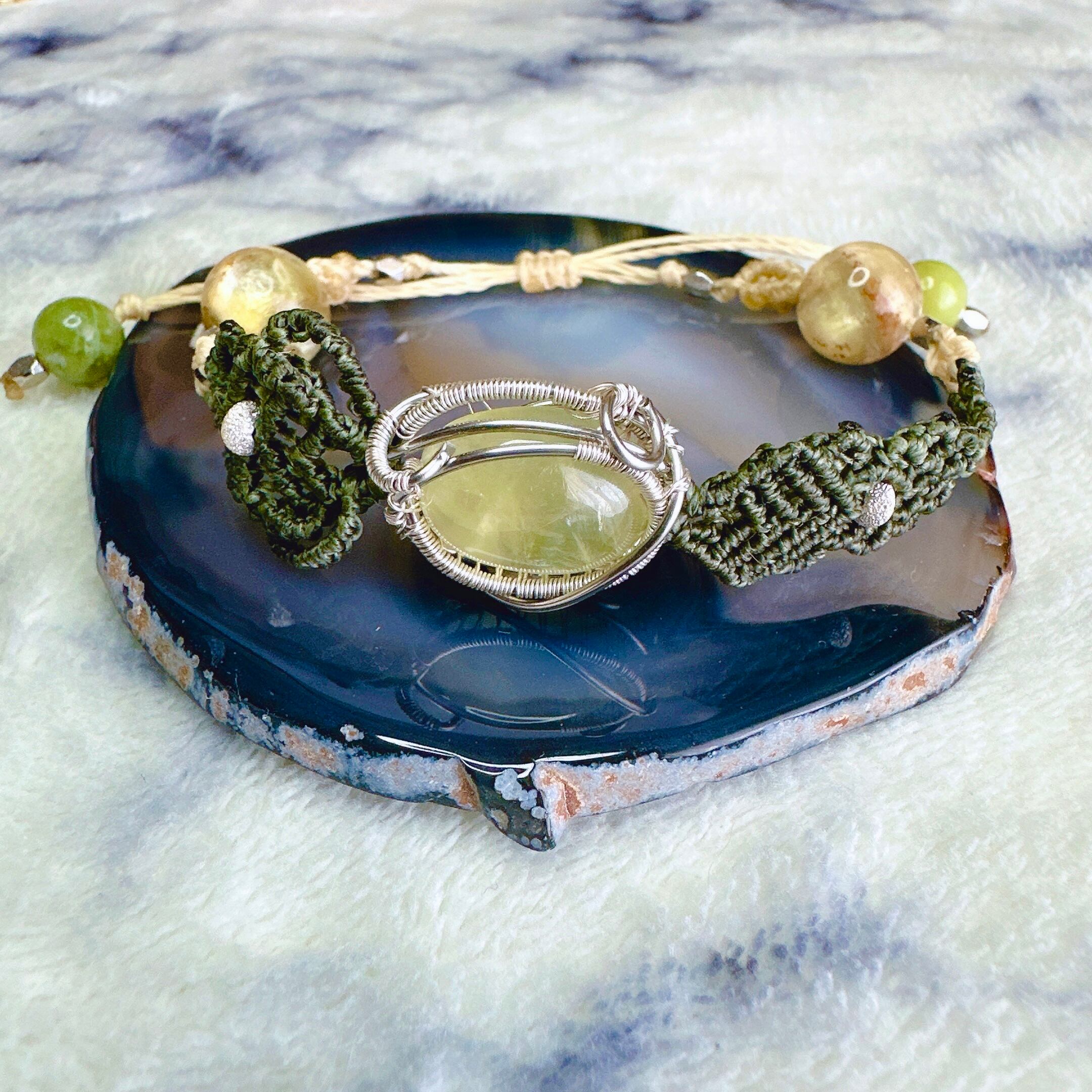 トロっとしたマスカットカラーのプレナイトのワイヤー&マクラメブレスレットです。