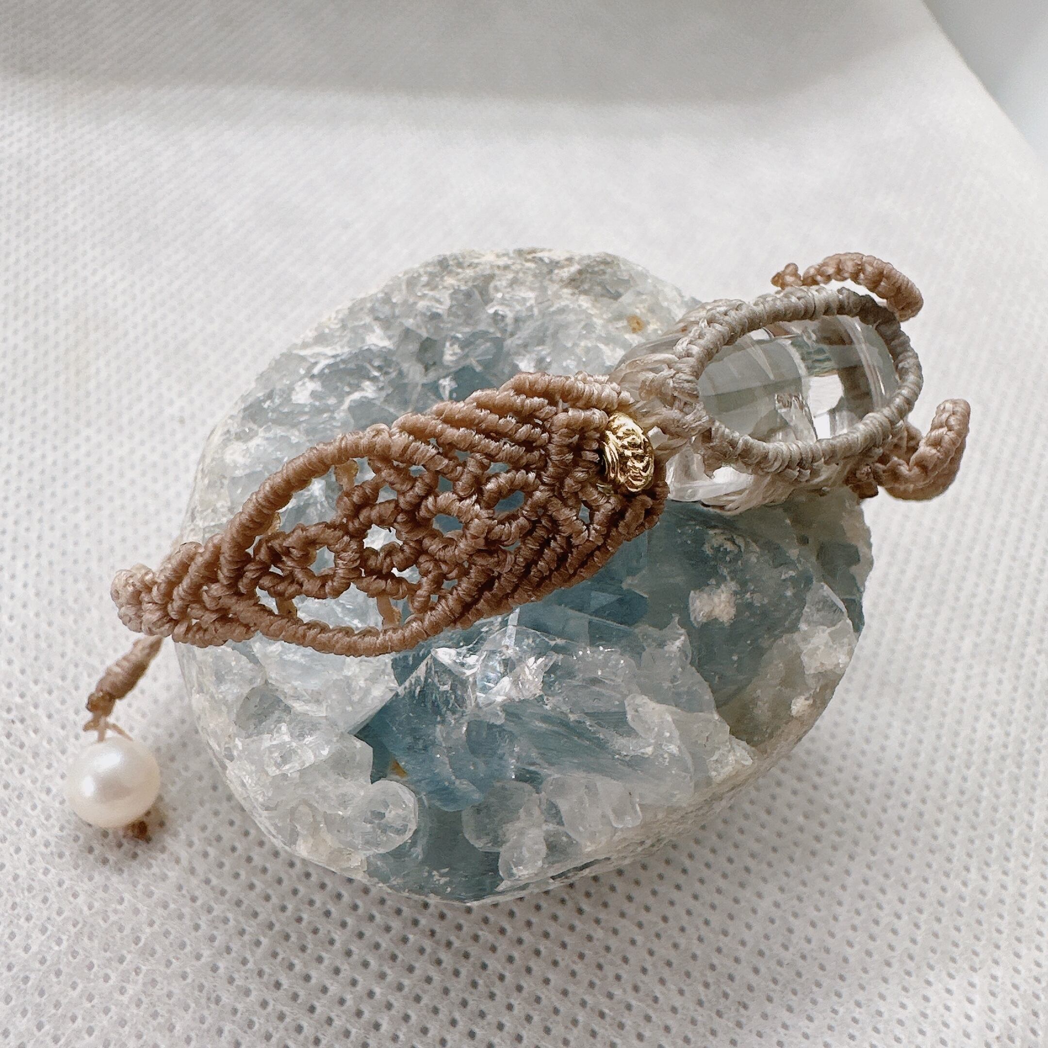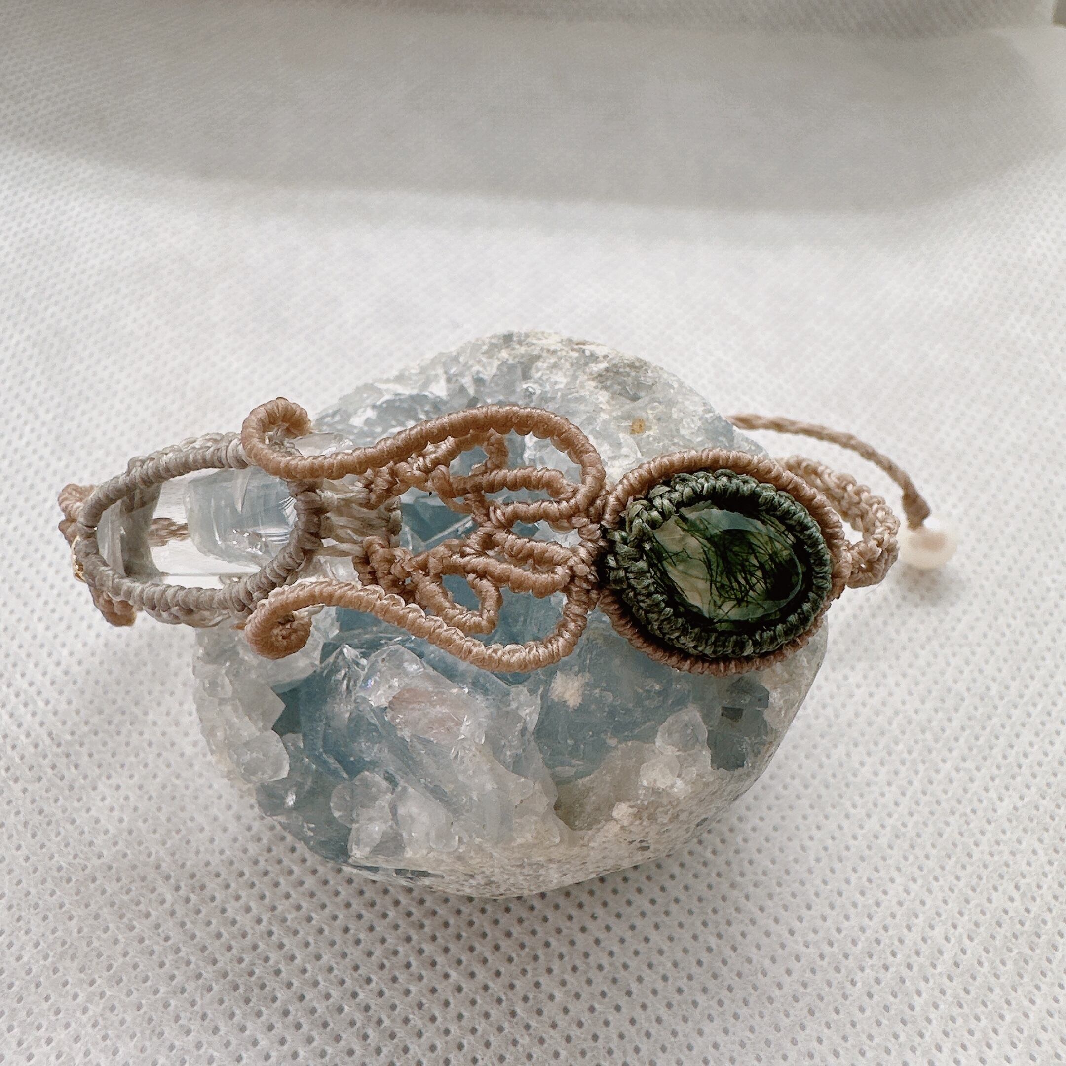 クォーツインクォーツとモスアゲートのマクラメブレスレットです。